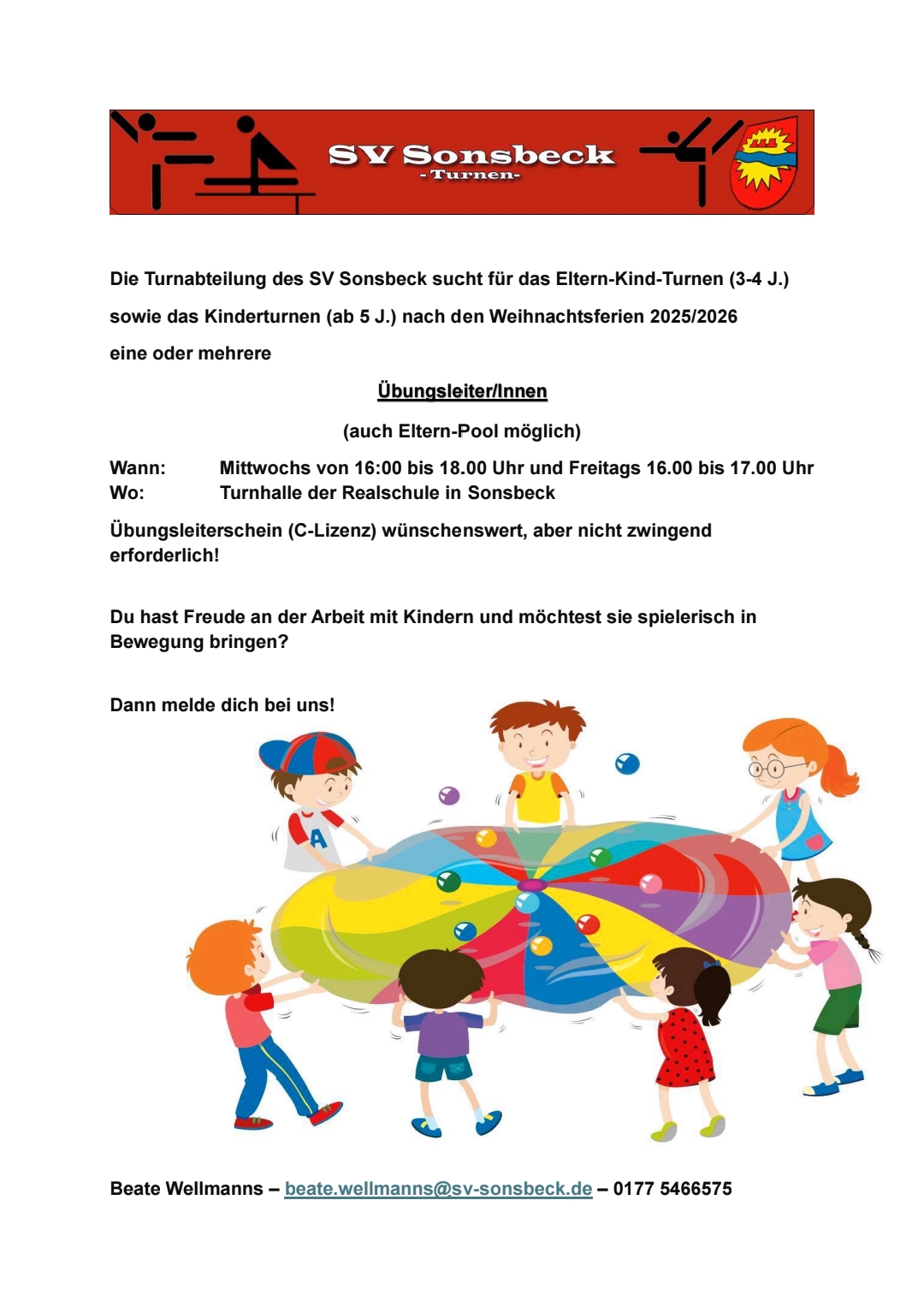 Die Turnabteilung des SV Sonsbeck sucht nach den Weihnachtsferien Übungsleiter/innen für das