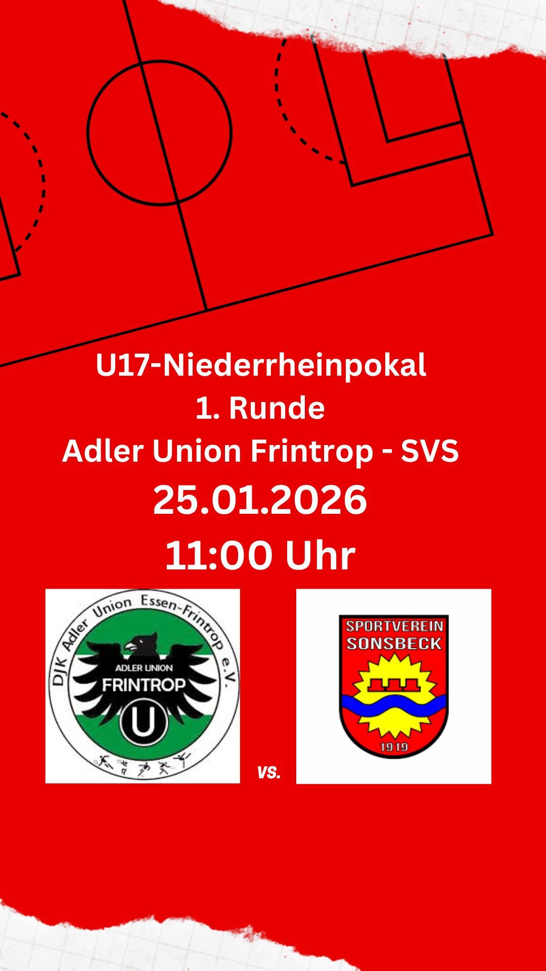 U17-Junioren reisen in der 1. Niederrheinpokalrunde zum Rhein-Ruhr-Liga-Spitzenreiter Ader Union Frintrop